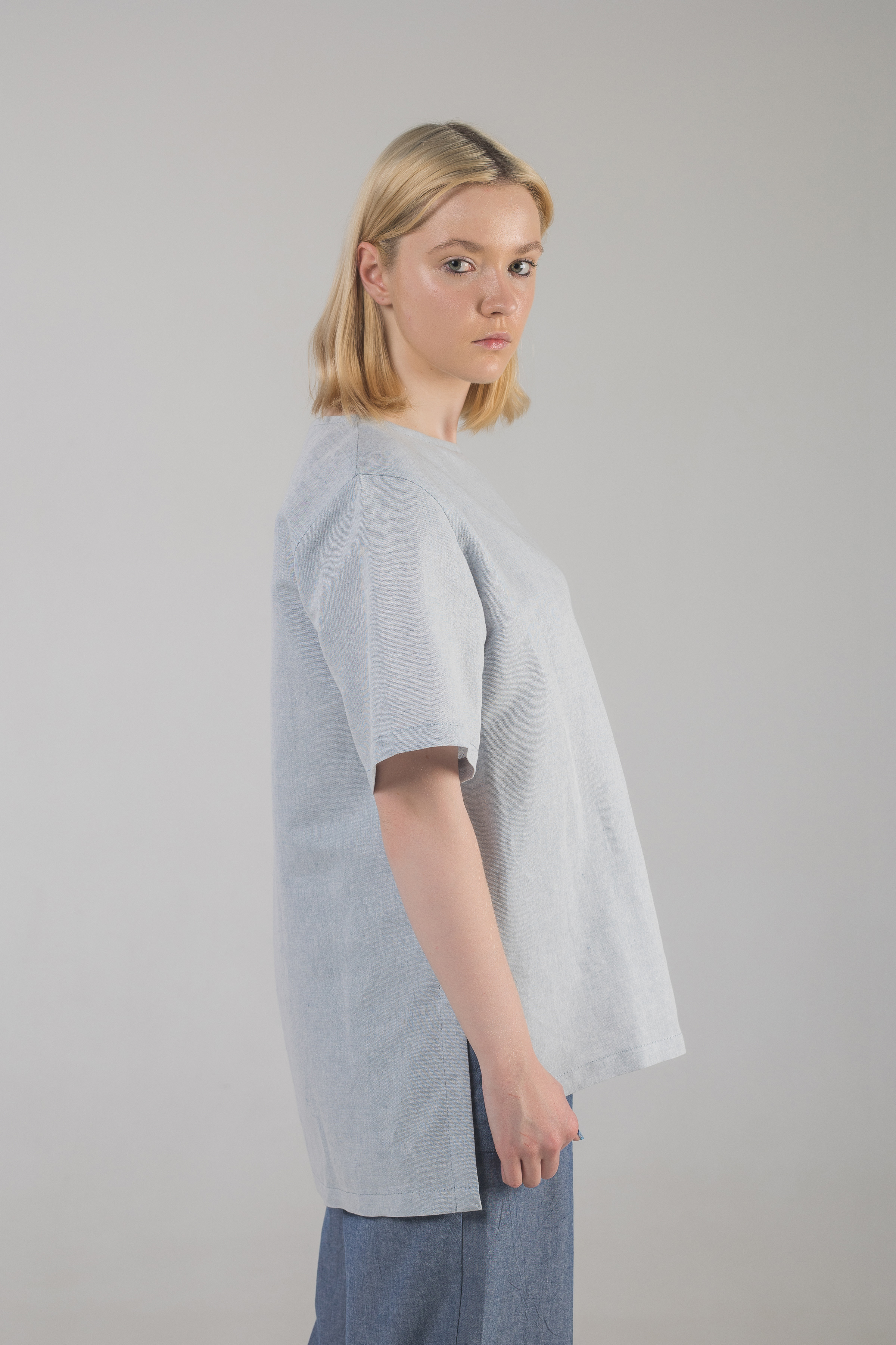 Crew neck linen T-shirt with side slits. Relaxed fit. Hand washing recommended. Wash in a washing machine at 40-60° on the wool or hand wash settings. Air-drying, avoid frost drying.
