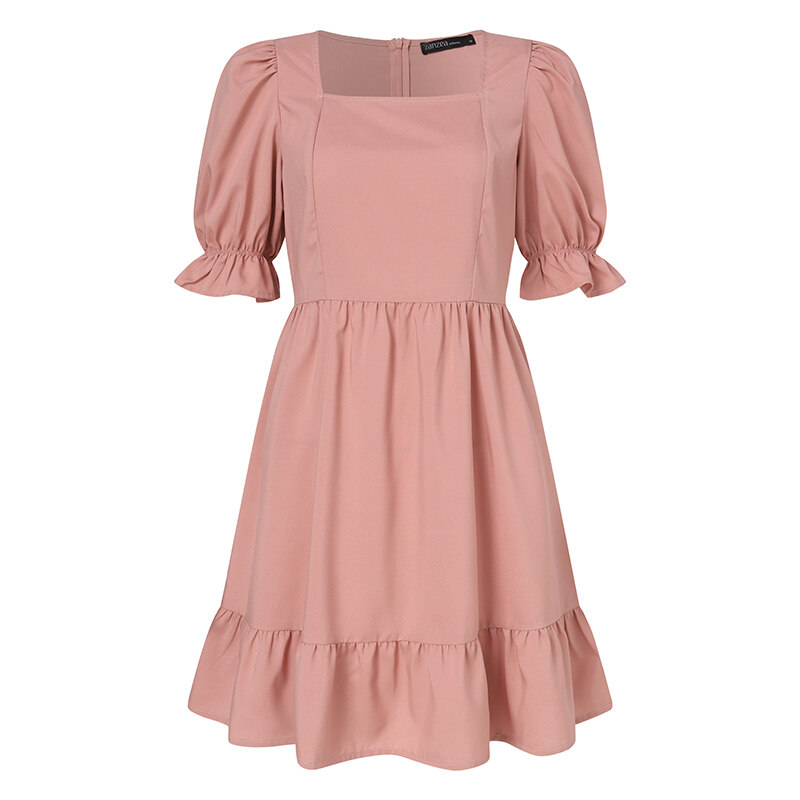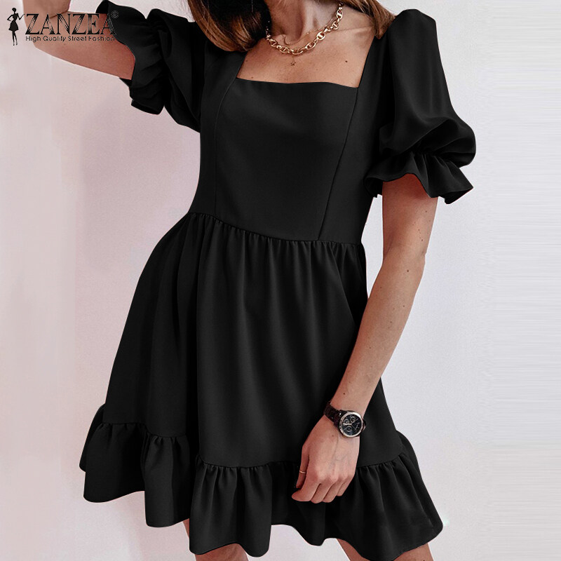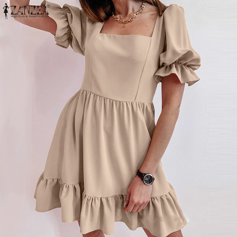 ZANZEA Women Square Neck Puff Sleeve Mini Shirt Dress Tiered Loose A-Line Sundress