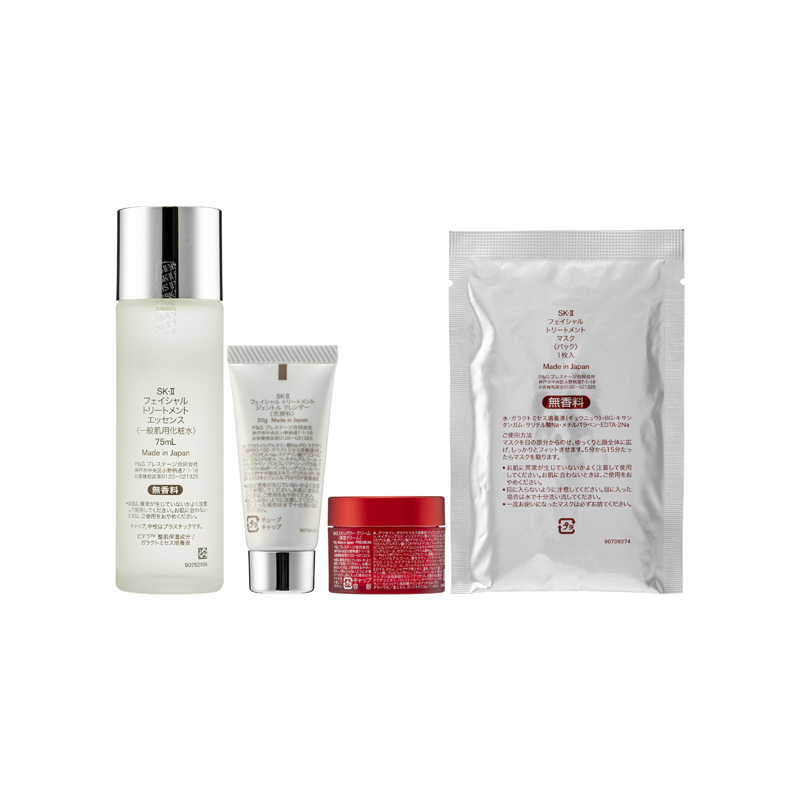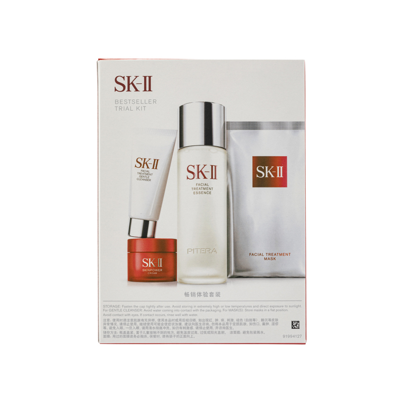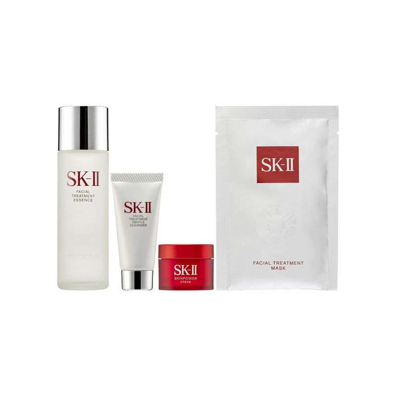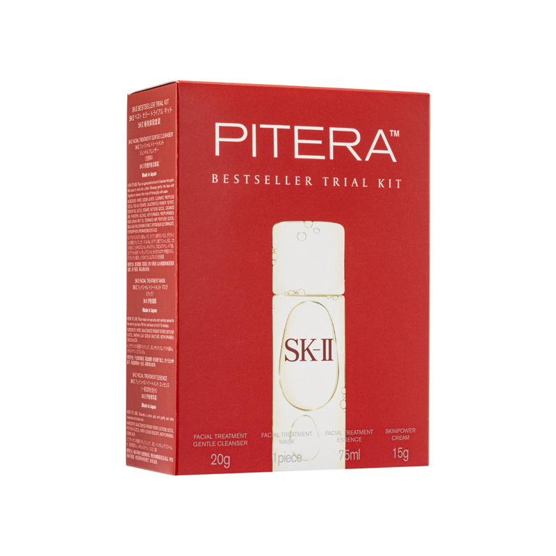 SK-II Bestseller Trial Kit (4PCS) This set of the star products of the brand, allowing you to experience the excellent anti-aging effects and creates a delicate skin texture, promoting excellent skincare anytime and anywhere.The set contains: Facial Treatment Gentle Cleanser (20g) Containing Concentrated Pitera™ and Mild Treatment Essence, it leaves your skin hydrated after cleansing. It can be transformed into fine-textured lather and gives mild rose scent. It refines skin texture, increases firmness, diminishes the appearance of wrinkles, enhances radiance and controls spots.Facial Treatment Essence (75ml) Facial Treatment Essence is SK-II’s signature product, containing rich Pitera™ that enhances skin regeneration and skin becomes breathtakingly crystal clear. It helps reducing appearance of wrinkles and age spots and enhancing firmness and radiance.Facial Treatment Mask (1PC) SK-II Facial Treatment Mask is an intensive moisture-boosting mask which gives you abundant Pitera™, to help restore skin renewal. Deeply hydrating your skin, it is like a facial treatment, leaving skin noticeably more radiant, soft and crystal clear. Skinpower Cream (15g) Formulated with the supercharging Infinitpower Technology, this upgrade version of the bestselling moisturizer contains a blend of powerful ingredients, such as Pitera™ and extracts from Lilies and Dokudami, skin hence becomes plumper, smoother and more translucent.Ingredients :Facial Treatment Gentle Cleanser •Pitera™: restricting free radicals and improving skin texture •Salix Alba (White Willow) Bark Extract: soothing•Dipotassium Glycyrrhizinate: anti-inflammatory<Facial Treatment Essence •Pitera™: restricting free radicals and improving skin texture•NMF: nourishing Facial Treatment Mask•Pitera™: restricting free radicals and improving skin texture Skinpower Cream •Pitera™: moderating skin's natural renewal cycle and strengthening skin•Quercetin, Calla Lily Extract: nourishing