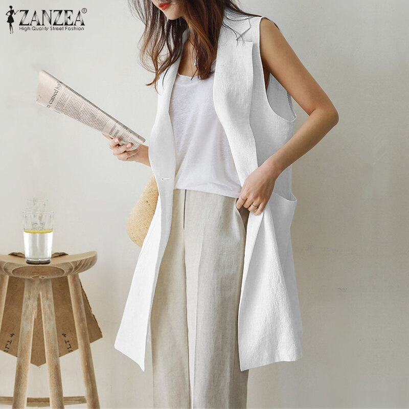ZANZEA Women Sleeveless Pure Cotton Blazer Suits Plain Basic Button Casual Waistcoat