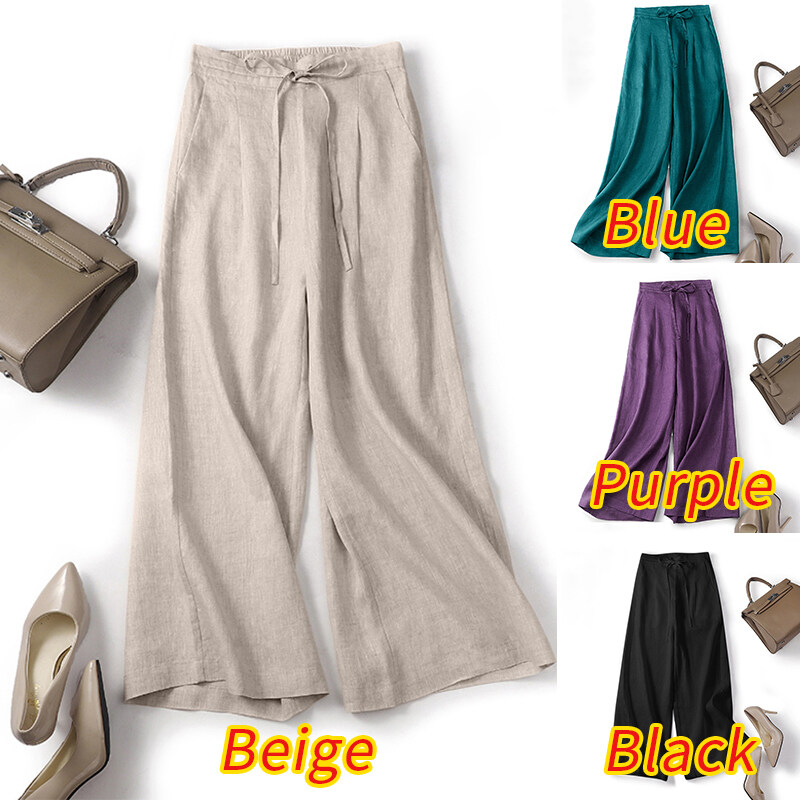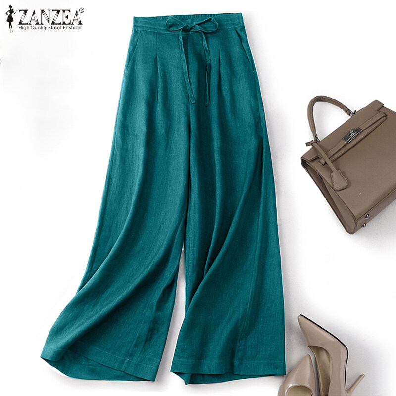 ZANZEA Women Drawstring Elastic Waist Plain Cotton Long Pants Loose Casual Trousers