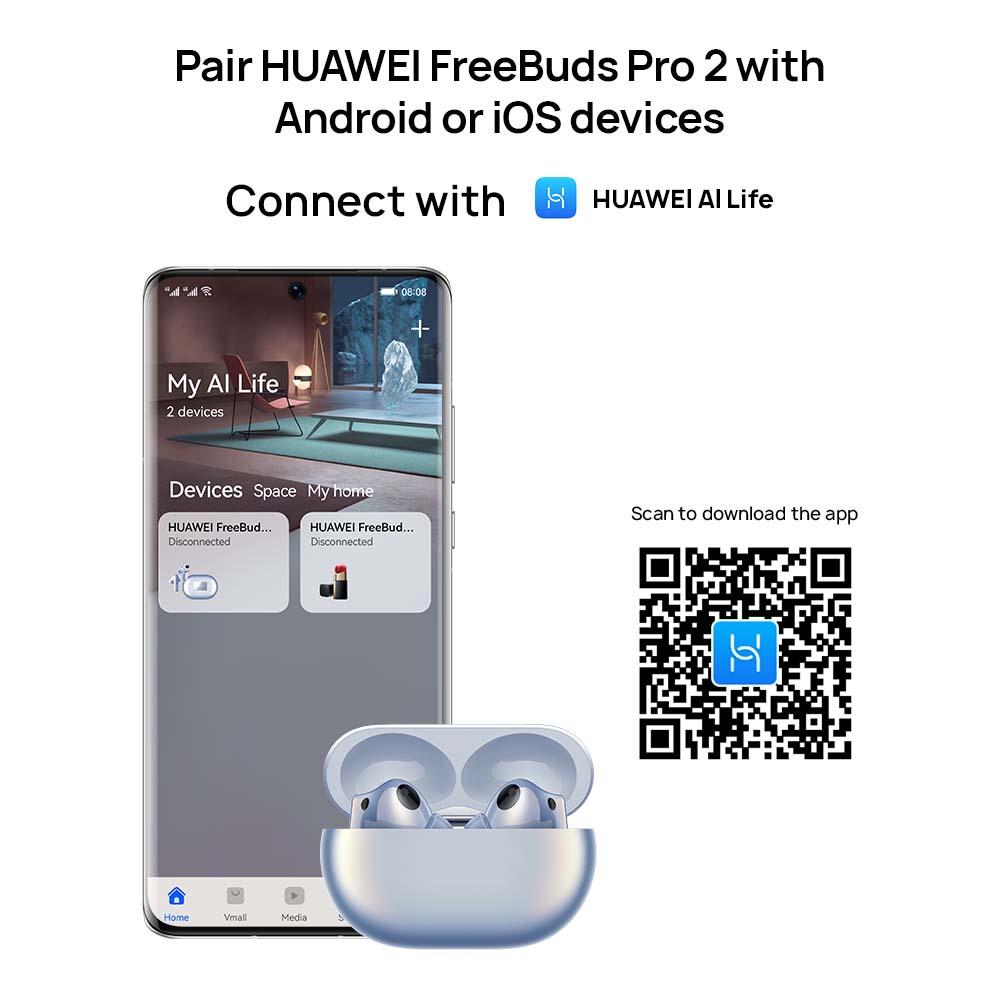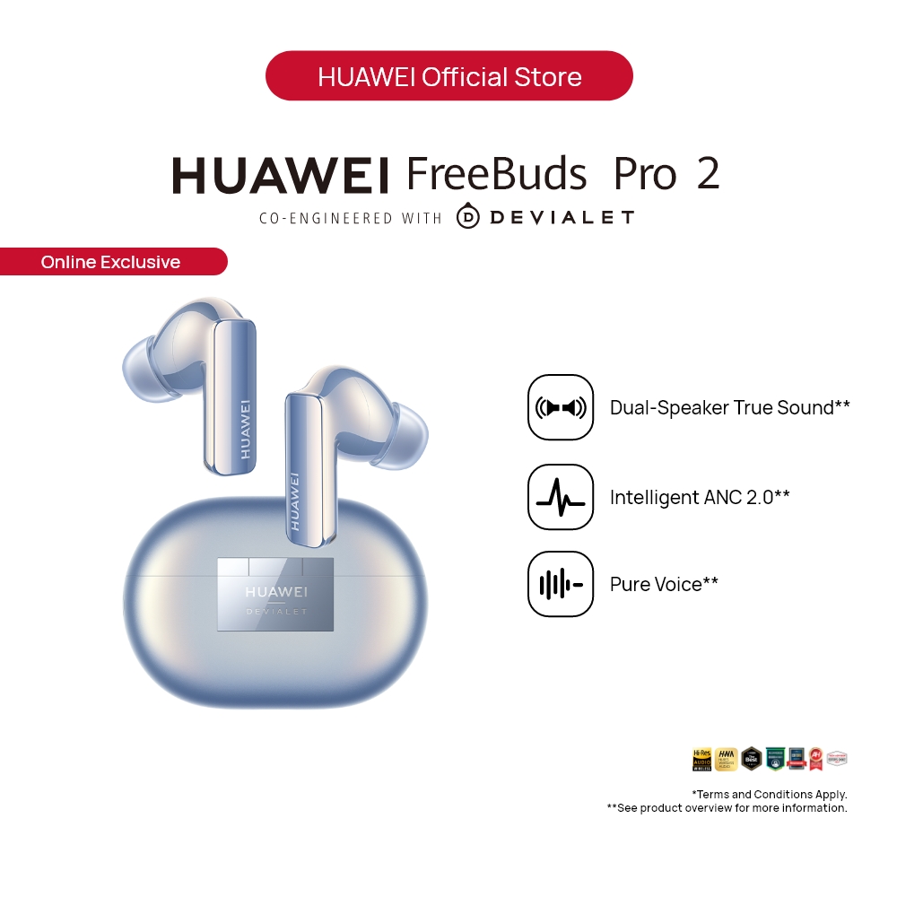 Dual-Speaker True sound: Lend your ears to HUAWEI FreeBuds Pro 2, and get lost in a rich cascade of sound, texture, and detail that far exceed your hearing range — from 14 Hz to 48 kHz — with luscious treble, surging bass, and everything between and beyond.* Pure Voice: HUAWEI FreeBuds Pro 2 never lets your surroundings get in the way of your calls, music, and movies, employing a bone conduction microphone, three additional microphones, and the Huawei-exclusive deep neural network (DNN) noise cancellation algorithm which has learned over 100 million voice samples to cancel out all manner of distraction, from noisy subway cars to windy conditions.** Intelligent ANC 2.0: The intelligent dynamic ANC 2.0 will switch your earbuds to the optimal noise cancellation mode in real time, with its ability to detect your ear canal structure, wearing status, and environmental noise, so that each note rings true. Triple Adaptive EQ: HUAWEI FreeBuds Pro 2 is smart at its core. It consistently brings you the optimal sound quality, by seamlessly tuning audio to the real-time volume level, your ear canal structure, and how you're wearing them. HWA and Hi-Res Audio Wireless Certified: HUAWEI FreeBuds Pro 2 supports LDACTM high-resolution codec, *** and is certified both by HWA and Hi-Res Audio Wireless, supporting blazing-fast transmission of up to 990 kbps, and transmitting pure high-fidelity sound that spares no detail. Dual Device Connection: Open the charging case, and your phone, tablet, or PC will automatically display a pop-up for pairing or reconnection. **** You can connect the earbuds to two devices at the same time and switch between the two devices automatically.