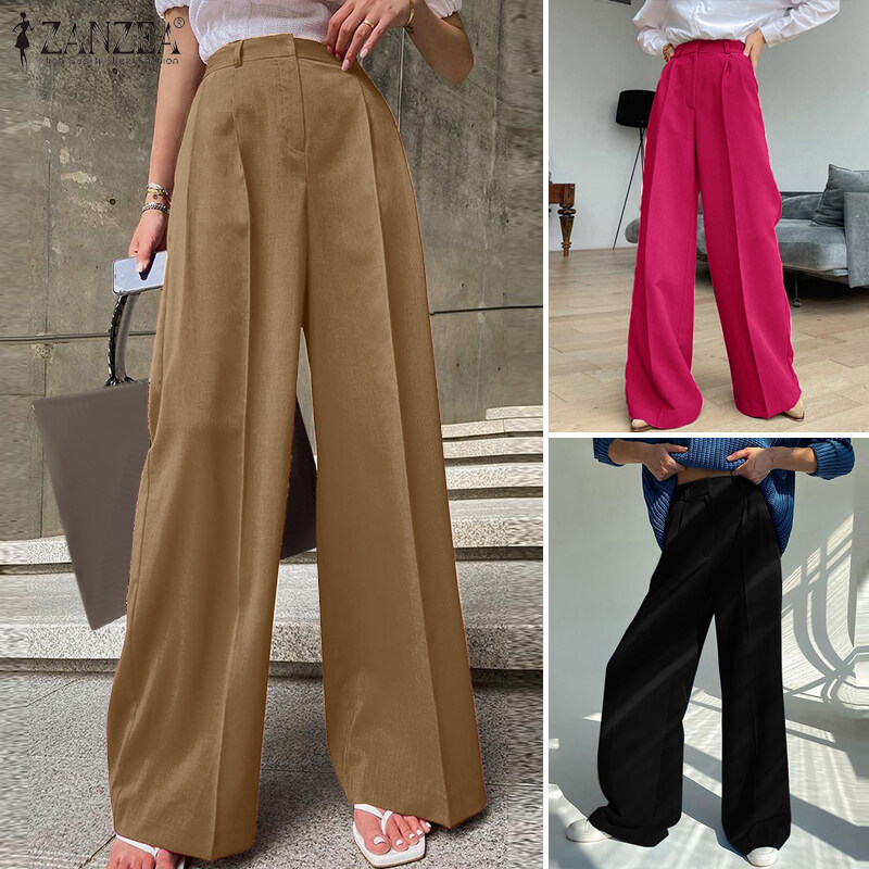 ZANZEA Womens High Waist Zipper OL Business Trousers Wide Leg Loose Casual Pants #15