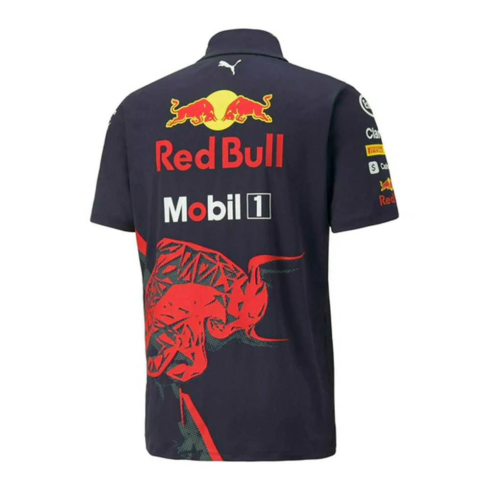 Feel the energy and equip your Red Bull F1 collection with one of the most essential items to your collection, The Team Polo for 2022. Designed with Red Bulls Dynamic Bull graphic at the back, sponsor logos on the front and a classic button-down collar it's instantly recognizable. Complete your look and match with the 2022 team cap. - Material: 100% Polyester - Red Bull Racing/partner logos on front, back & sleeve - Bull graphic on rear - 3 button placket