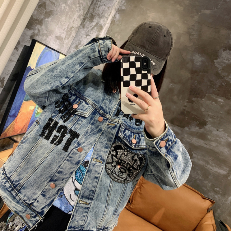 Spring Autumn Jeans Coat Men's and Women's Denim Jacket Washed Rhinestone High Street Style Fashion Handsome Casual Jacket