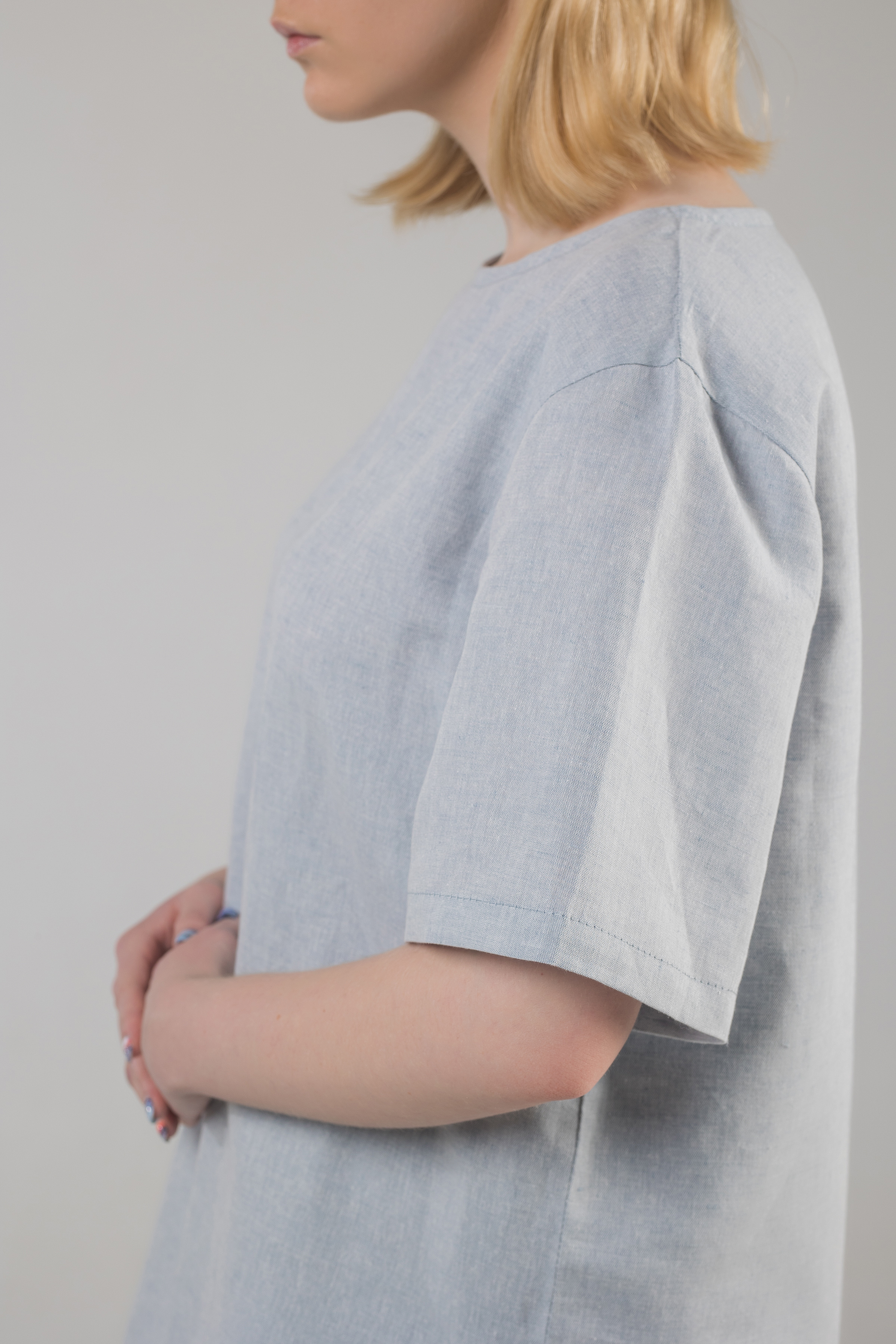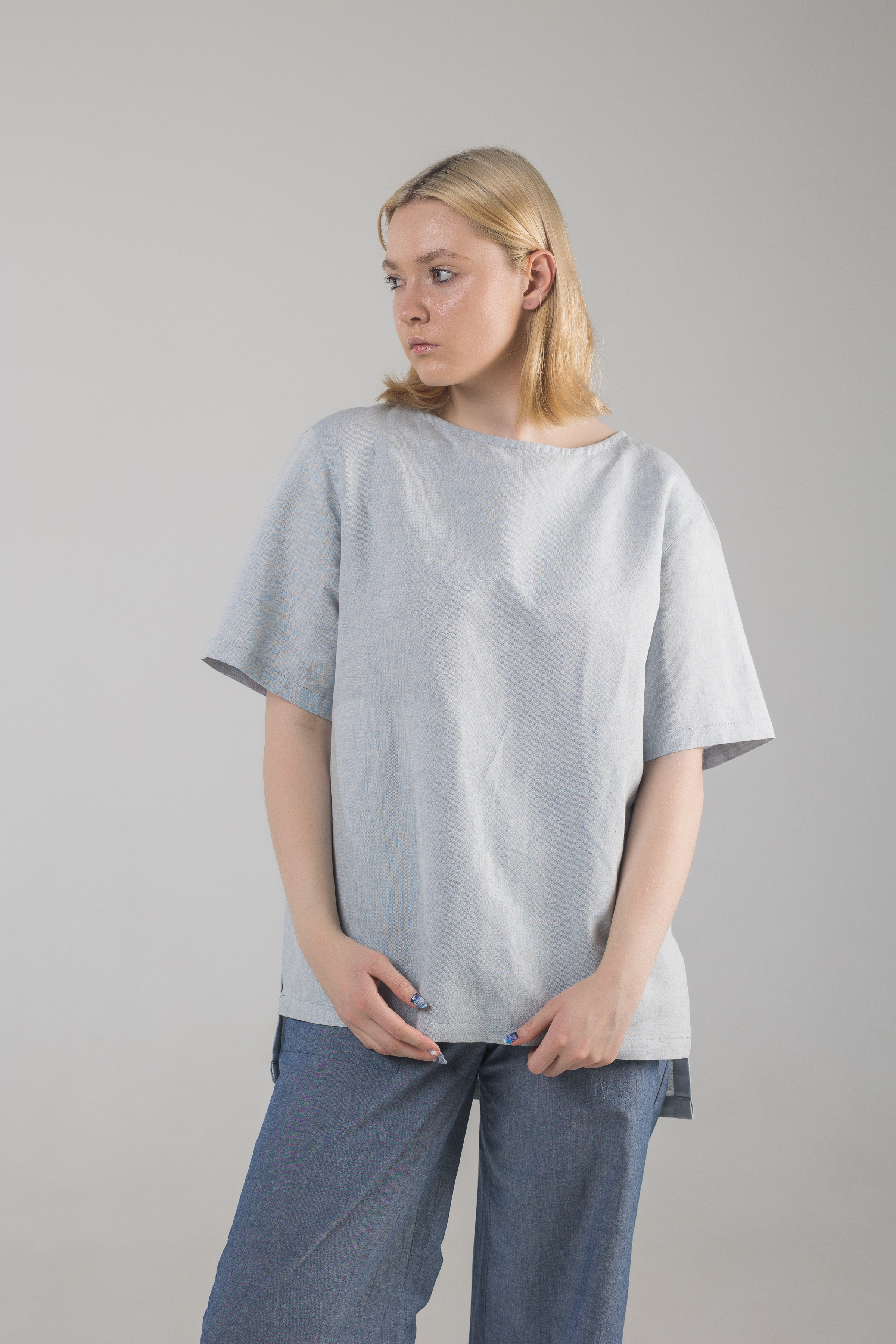 Crew neck linen T-shirt with side slits. Relaxed fit. Hand washing recommended. Wash in a washing machine at 40-60° on the wool or hand wash settings. Air-drying, avoid frost drying.