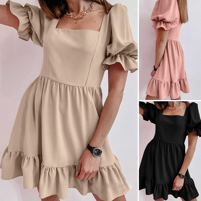 ZANZEA Women Square Neck Puff Sleeve Mini Shirt Dress Tiered Loose A-Line Sundress
