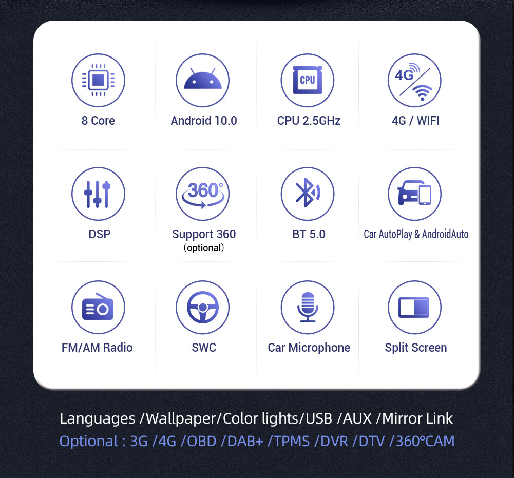 • DSP+Carplay+Touch Screen+Radio+FM/AM+RDS+GPS Navigation+MAP+Wifi+Bluetooth+Steering Wheel Control +Split Screen + USB+SD+AUX in/Out+Mirror Link+Rear View Camera+Subwoofer+Play Sore+EQ+Wallpaper Set+Car Logo+3G/4G+TPMS+DAB+OBD 2+DVR+TV