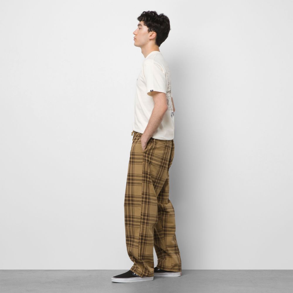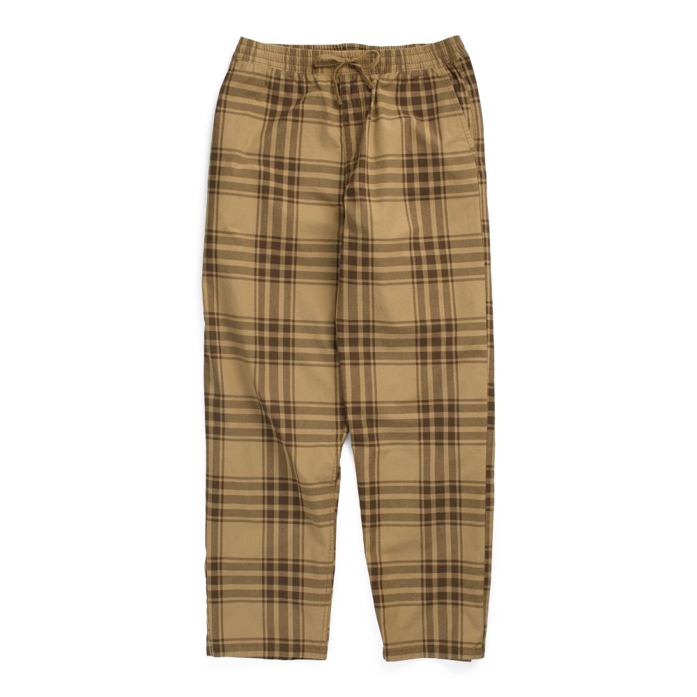 Built around an easy pull-on elastic waist for all-day, everyday wear, this versatile pant features a long rise at the waist that stays baggy through the hip and thigh, ending in a tapered leg. The cotton fabrication offers a soft hand feel, while an allover plaid print and subtle brand details keep the style on point: Drop-V bar tack embroidery at the side seam and pockets, a key loop on the right rear waistband, and a branded flag label sewn into the hem of the leg opening that’s visible when cuffed.